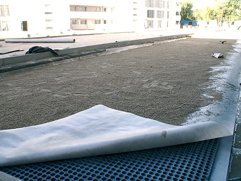 Aby zapobiec wymywaniu drobniejszych części podłoża, należy nałożyć na folię warstwę filtracyjną 100 g nietkanej geowłókniny. Następnie na tej warstwie układa się substrat z warstwą roślinności.