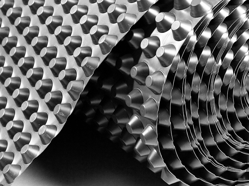 Folia do fundamentów w profilu składa się z półstożkowych wytłoczeń (kubełków) o wysokości 8 mm, z minimalną liczbą 1800 wytłoczeń na m² (wariant podstawowy). Odgrywa ona rolę pionowej warstwy drenażowej. Umożliwia przepływ powietrza, zmniejszając w ten sposób zawilgocenie muru fundamentowego i zapobiegając przedostawaniu się radonu do wewnętrznych części budynku.