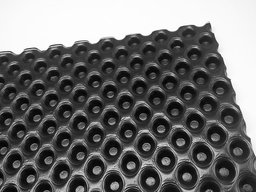 Folia do fundamentów w profilu składa się z półstożkowych wytłoczeń (kubełków) o wysokości 8 mm, z minimalną liczbą 1800 wytłoczeń na m² (wariant podstawowy). Odgrywa ona rolę pionowej warstwy drenażowej. Umożliwia przepływ powietrza, zmniejszając w ten sposób zawilgocenie muru fundamentowego i zapobiegając przedostawaniu się radonu do wewnętrznych części budynku.