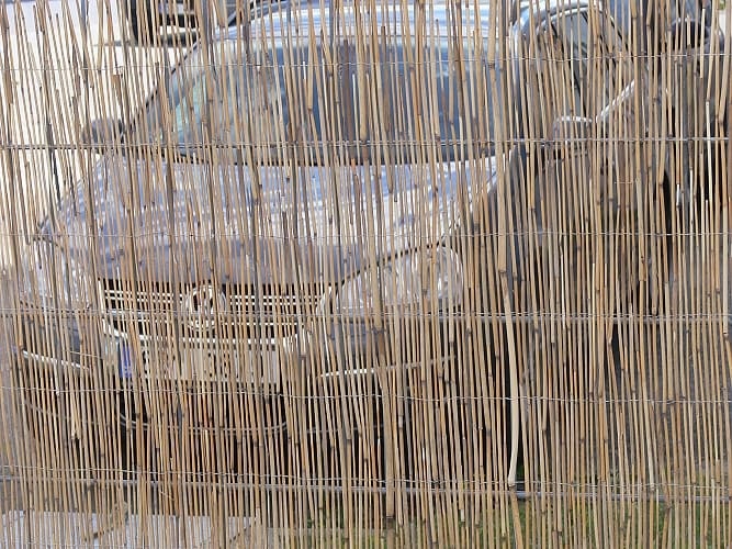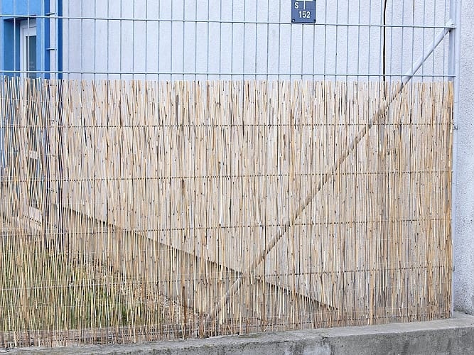 Osłonę trzcinową można również zamontować na płocie stojącym, wystarczy przymocować ją za pomocą mocnego drutu. W razie potrzeby można dopasować ją do żądanej wielkości. Następnie należy związać źdźbła z powrotem przy użyciu drutu wiązałkowego, który trzyma szczepy razem, aby osłona się nie rozleciała.