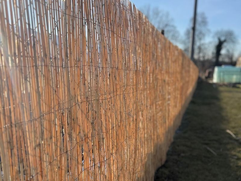 Osłonę trzcinową można również zamontować na płocie stojącym, wystarczy przymocować ją za pomocą mocnego drutu. W razie potrzeby można dopasować ją do żądanej wielkości. Następnie należy związać źdźbła z powrotem przy użyciu drutu wiązałkowego, który trzyma szczepy razem, aby osłona się nie rozleciała.