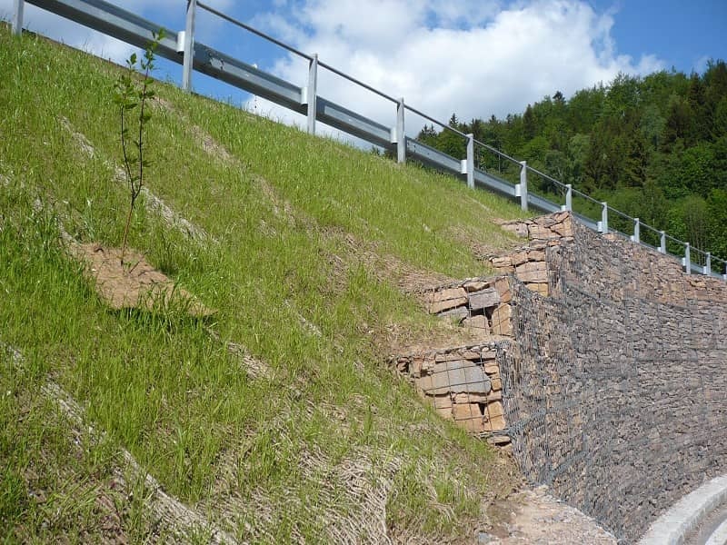 We wszystkich przypadkach będzie konieczne zakotwienie produktów na wzniesieniu, np. na 30 centymetrowym za pomocą metalowych szpil Geopin Steel (2-4 sztuki/m2 powierzchni zbocza). Produktów (z wyjątkiem geomaty Trinter) nie zasypuje się glebą.