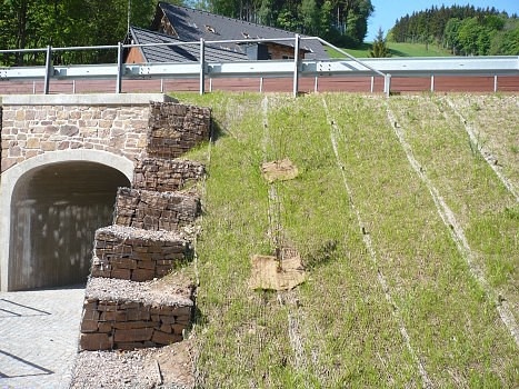 We wszystkich przypadkach będzie konieczne zakotwienie produktów na wzniesieniu, np. na 30 centymetrowym za pomocą metalowych szpil Geopin Steel (2-4 sztuki/m2 powierzchni zbocza). Produktów (z wyjątkiem geomaty Trinter) nie zasypuje się glebą.
