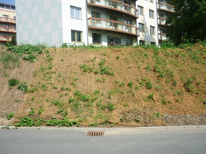 Siatkę kokosową można stosować w połączeniu z agrowłókniną lub biowłókniną wykonaną z biomasy, zapobiegając tym samym rozwojowi chwastów na skarpach ogrodowych, obsadzonych krzewami i roślinami wieloletnimi. Do mocowania siatki przeciwerozyjnej na zboczach zalecamy użycie szpilek metalowych Geopin Steel.