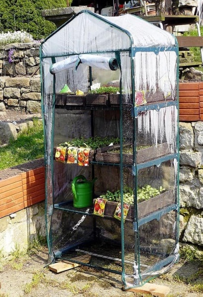 Szklarnia balkonowa. Konstrukcją przypominająca stalową rama powleczona folią, tak zwany tunel foliowy. Przezroczysta folia z podwójnym zamkiem dla łatwego dostępu.